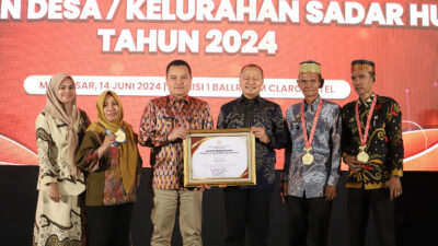 “Peresmian ini merupakan prestasi dan hasil kerja nyata melalui pelaksanaan pembinaan kelompok keluarga sadar hukum (KADARKUM), pengembangan Desa/Kelurahan Binaan, sampai dengan terbentuknya Desa/Kelurahan Sadar Hukum,” ujarnya di Claro Hotel Makassar.Jumàt, 14/6/2024.