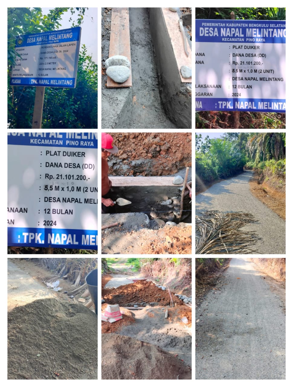 Proyek pembangunan jalan lapen dan plat duiker di desa napal melintang, kecamatan pino raya, kabupaten bengkulu selatan, terdapat indikasi dugaan mark-up dan indikasi korupsi yang melibatkan oknum pejabat desa, rabu (17/07/2024).