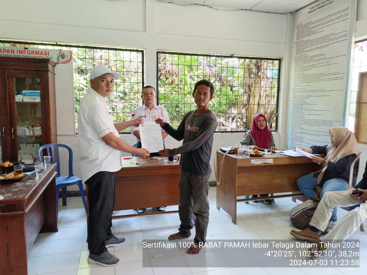 Sertifikasi ini disaksikan oleh Pino Raya, BPD, Tokoh masyarakat, Agama dan pendamping Desa.