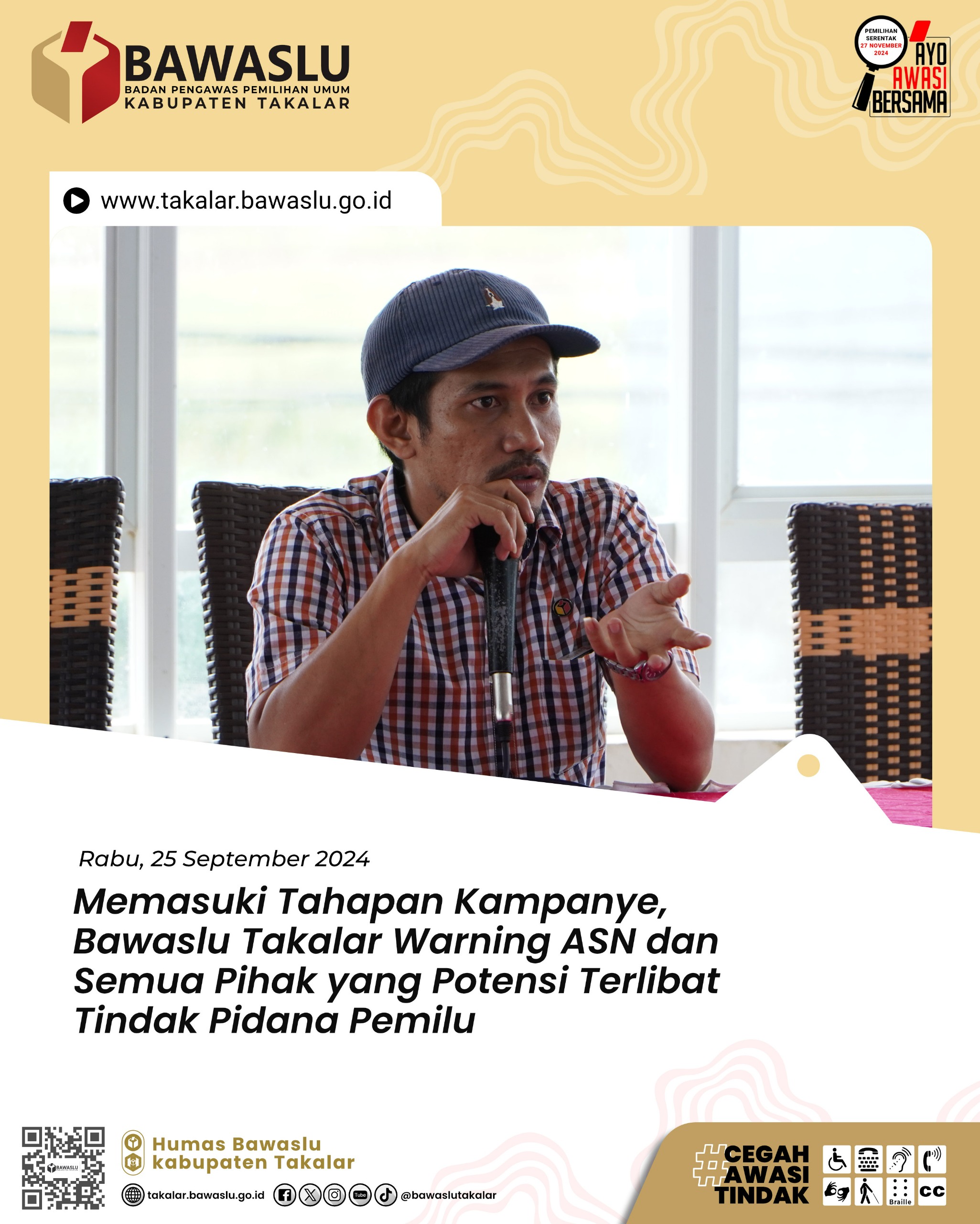 “Bawaslu Takalar warning ASN dan semua pihak yang berpotensi terlibat tindak pidana pemilu untuk tidak melakukan upaya pelanggaran pada pemilihan serentak di Kabupaten Takalar”, ucap Ince Hadiy Rachmat, Kordiv PPPS Bawaslu Takalar, Rabu (25/9/2024).