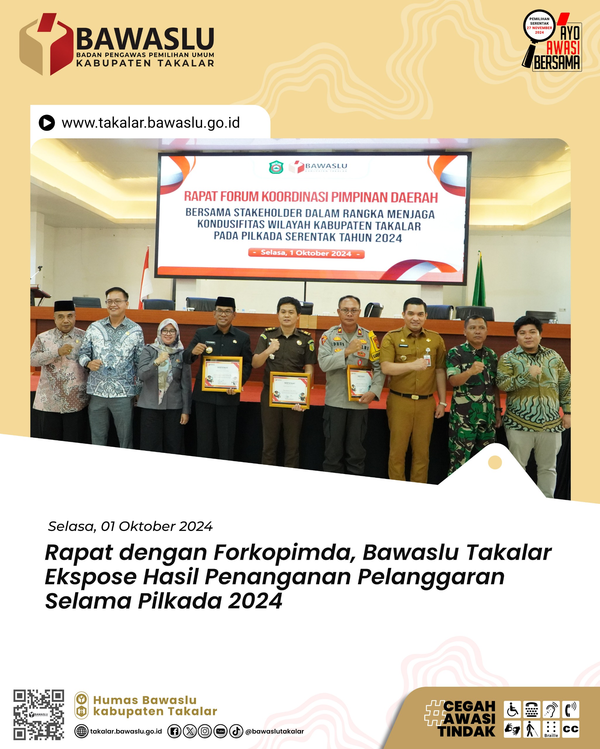 Kami sampaikan pada forum rapat ini, sekiranya semua pihak terus mempercayakan kepada kami bahwa integritas pengawas pada Pemilihan pasti akan menindaklanjuti segala laporan dan temuan pada perhelatan Pilkada serentak tahun 2024 di Kabupaten Takalar, tutupnya.