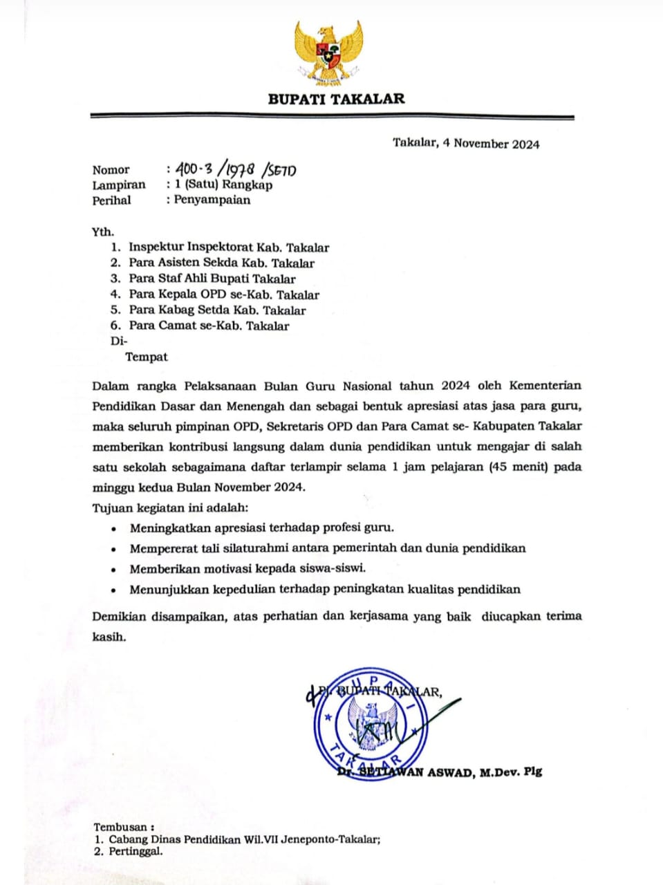 Takalar, Selasa, 5 November 2025 – Dalam rangka memperingati Bulan Guru Nasional tahun 2024 yang diselenggarakan oleh Kementerian Pendidikan Dasar dan Menengah, PJ Bupati Takalar, DR. Setiawan Aswad, M.Dev.Plg mengeluarkan surat penyampaian dalam bentuk apresiasinya atas dedikasi dan jasa para guru.