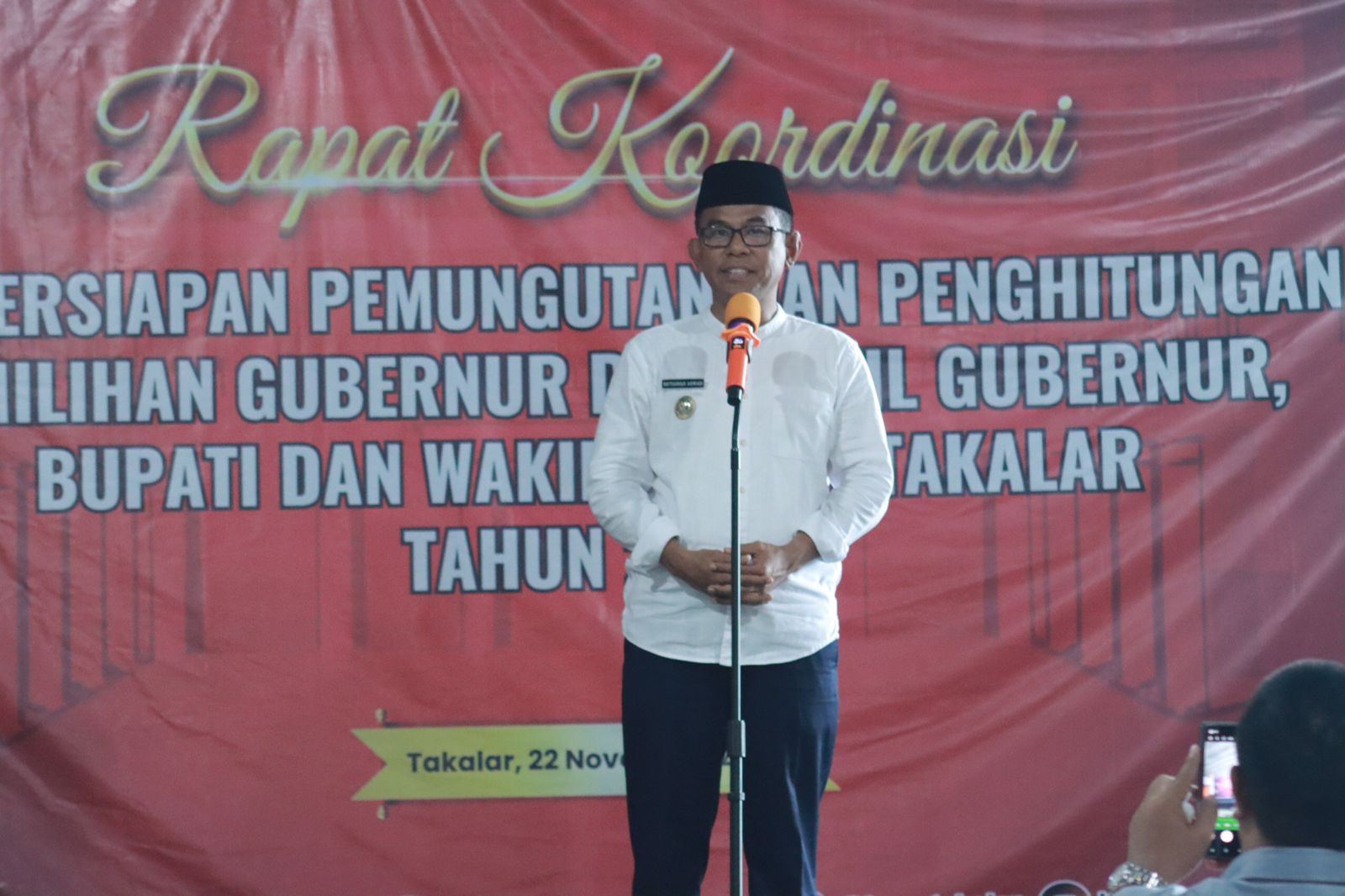 Diskominfo-Sp, 22 November 2024 Pj. Bupati Takalar Dr. Setiawan Aswad, M.Dev.,Plg, bersama Forkopimda Kabupaten Takalar, menghadiri Rapat Koordinasi Finalisasi Persiapan Pemungutan dan Penghitungan Suara pada Pemilihan Gubernur, Wakil Gubernur, Bupati, dan Wakil Bupati Takalar Tahun 2024. Rapat tersebut berlangsung di Wisata Kuliner Tiga Dimensi, Kecamatan Polongbangkeng Utara, Kabupaten Takalar.