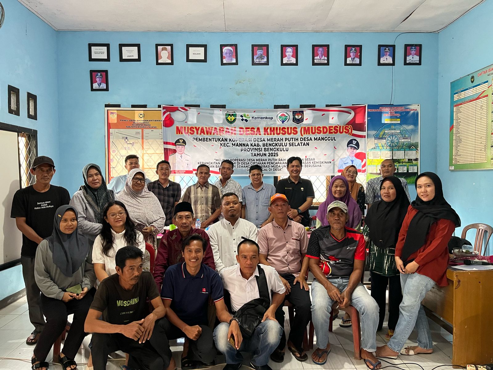 Desa Manggul Bentuk Koperasi “Merah Putih” Sesuai Intruksi Presiden No 9 Tahun 2025. Warga Desa Manggul, Kecamatan Manna Kabupaten Bengkulu Selatan, melaksanakan Musyawarah Desa Khusus (MUSDESUS) untuk membentuk Koperasi Desa Merah Putih, Jum’at (23/05/2025).