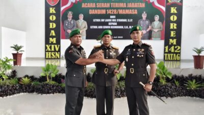 Mamuju,.LlntasJurnaltipikor.com.–” Upacara Serah Terima jabatan Di kubub institusi TNI bukan hal yang baru dalam istafet tongkat komando adalah hal yang wajib karena jabatan ke pemimpinan tidak abadi dan hak paten. Seperti yang yang di laksanakan olehKomandan Korem 142/Tatag Brigjen TNI Hartono, S.I.P., M.M.,yang memimpin langsung acara Serah Terima Jabatan Komandan Kodim 1428/Mamasa dari Letkol Inf Laode Iril Syahdar, S.I.P., kepada Letkol Arh Edwin Hermawan, S.H., M.A.P., yang digelar di Aula Andi Depu Makorem 142/Tatag, Jalan Abdul Malik Pattana Endeng, Kabupaten Mamuju, Provinsi Sulawesi Barat, Selasa (1/7/2025).