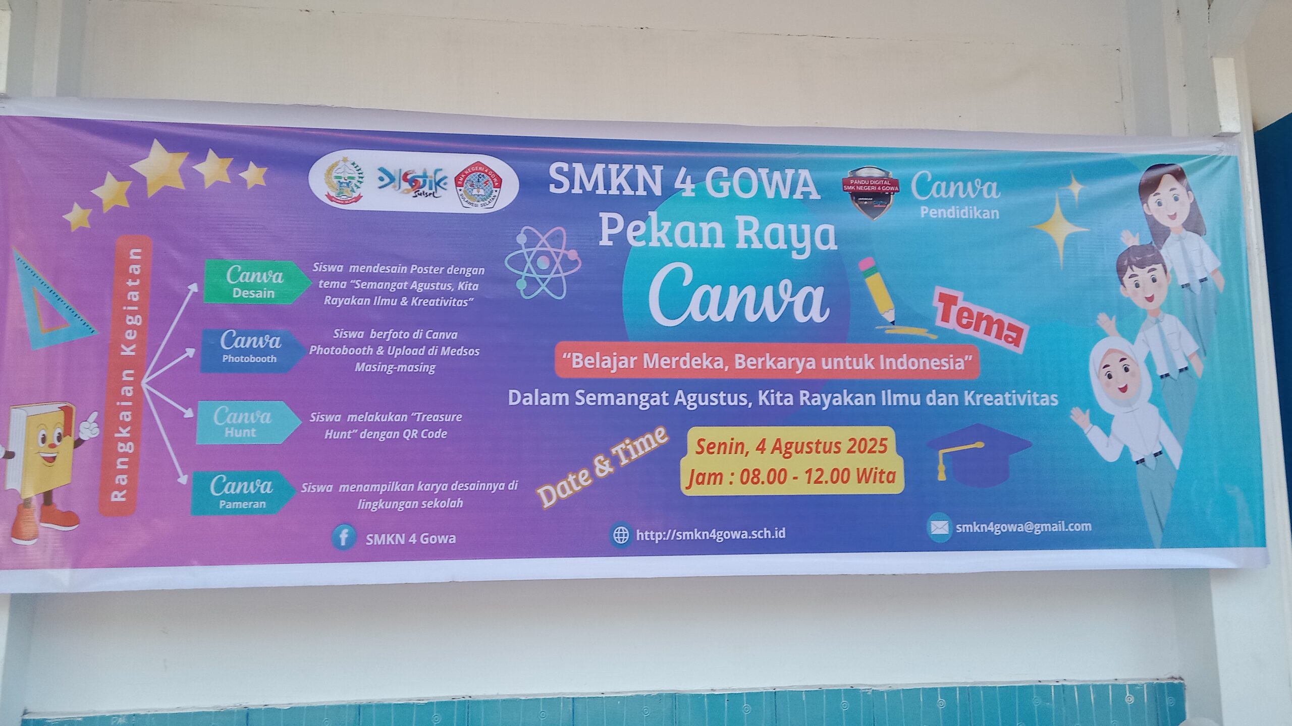 Kepala UPT SMKN 4 Gowa yang biasanya disapa Pak Iman. Menyampaikan ke media ini, jika disekolah hari ini (4 Agustus 2025). Telah dilakukan berbagai kegiatan, seperti Literasi Nasional dan pelatihan pengenalan aplikasi Canva sebagai desain gambar dan video kepada siswa-siswi SMKN 4 Gowa.