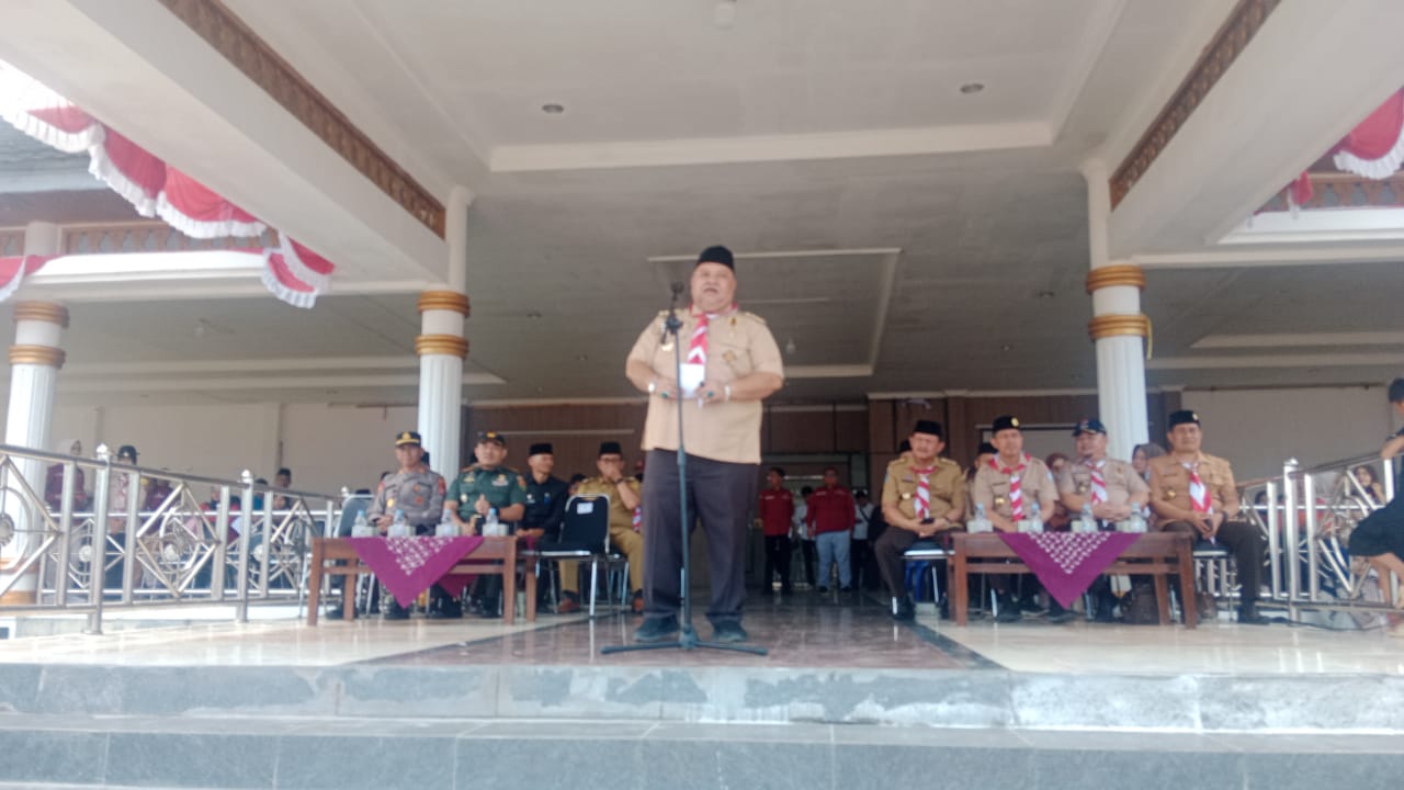 Bupati, H. Rifai Tajudin, bersama Wakil Bupati, Yevri Sudianto, menghadiri sekaligus melepas Pawai Tunas Kelapa dalam rangka menyambut Hari Pramuka ke-64 dan Hari Kemerdekaan Republik Indonesia ke-80 Tahun 2025 di lapangan sekundang Senin (11/08/2025).
