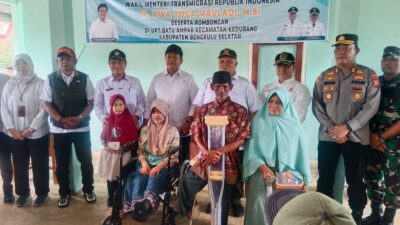 Bupati Bengkulu Selatan H. Rifa’i Tajudin menyambut kedatangan Wakil Menteri Transmigrasi Ripublik Indonesia H. Viva Yoga Mauladi, M.Si beserta Rombongan di UPT Batu Ampar Kecamatan Kedurang Kabupaten Bengkulu Selatan.Rabu(10/09/2025).Turut hadir dalam kegiatan tersebut Sekretaris Daerah Provinsi Bengkulu, Kepala Dinas, Camat se-Bengkulu Selatan, serta para Tamu Undangan lainnya yang ikut memberikan dukungan atas kunjungan kerja Wamen tersebut.