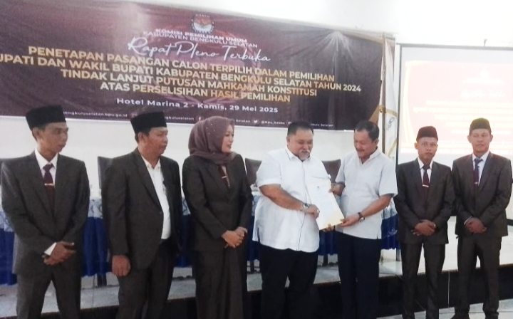 Komisi Pemilihan Umum (KPU) Kabupaten Bengkulu Selatan resmi menetapkan pasangan H. Rifai Tajudin dan Yevri Sudianto sebagai Bupati dan Wakil Bupati terpilih untuk periode 2025–2030 dalam Rapat Pleno Terbuka yang digelar di Hotel Marina 2, Kamis (29/5/2025).