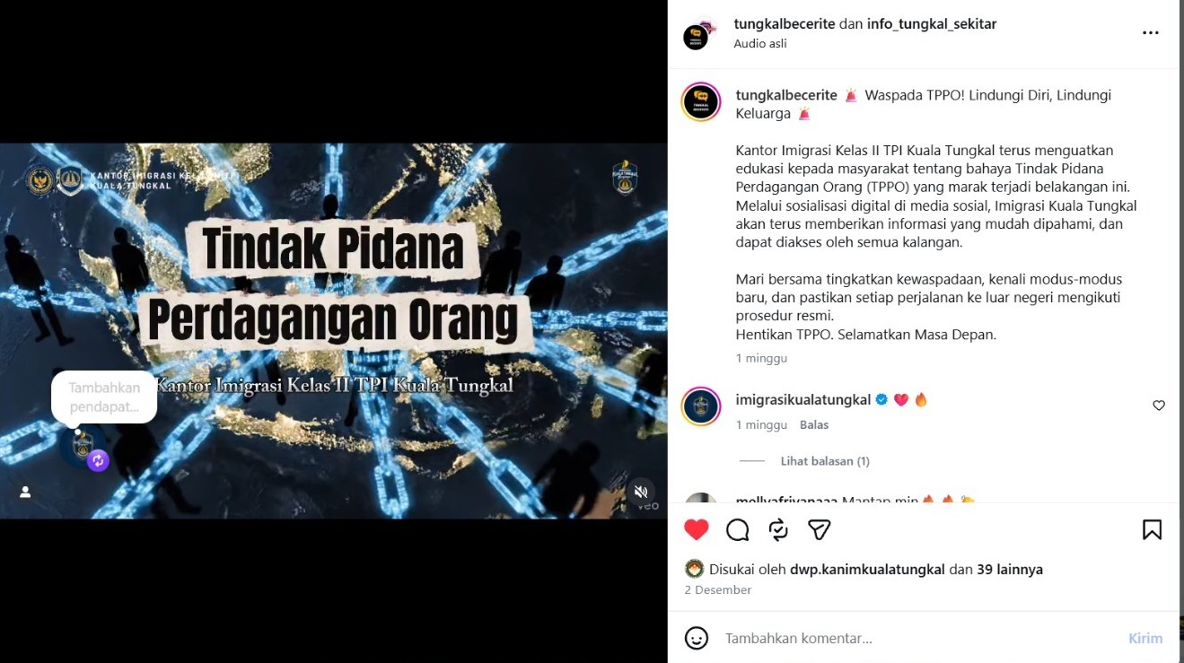 Kuala Tungkal – – Kantor Imigrasi Kelas II TPI Kuala Tungkal kembali menunjukkan komitmennya dalam upaya pencegahan Tindak Pidana Perdagangan Orang (TPPO), dengan menghadirkan terobosan baru melalui sosial digital.