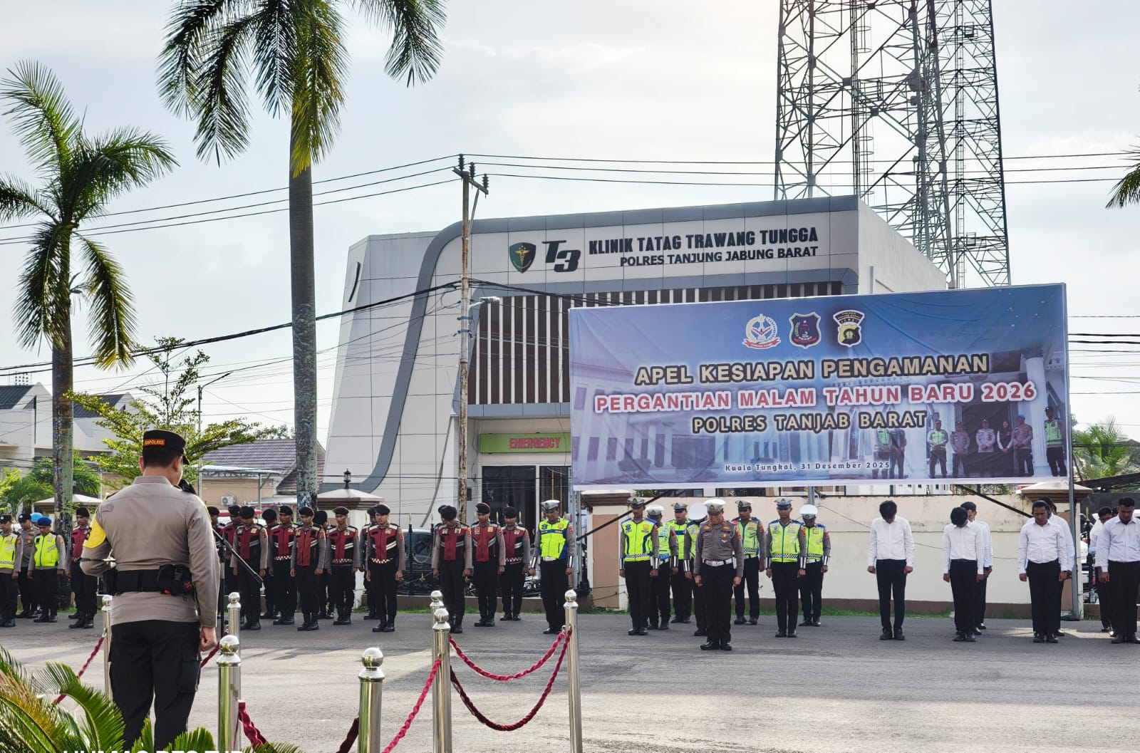 KUALA TUNGKAL – Kepolisian Resor (Polres) Tanjung Jabung Barat menggelar Apel Kesiapan Pengamanan untuk rangkaian perayaan Ibadah Natal 2025 dan kegiatan masyarakat pada malam pergantian Tahun Baru 2026. Kegiatan apel berlangsung di lapangan Mapolres Tanjab Barat pada hari Rabu (31/12/2025) sore.