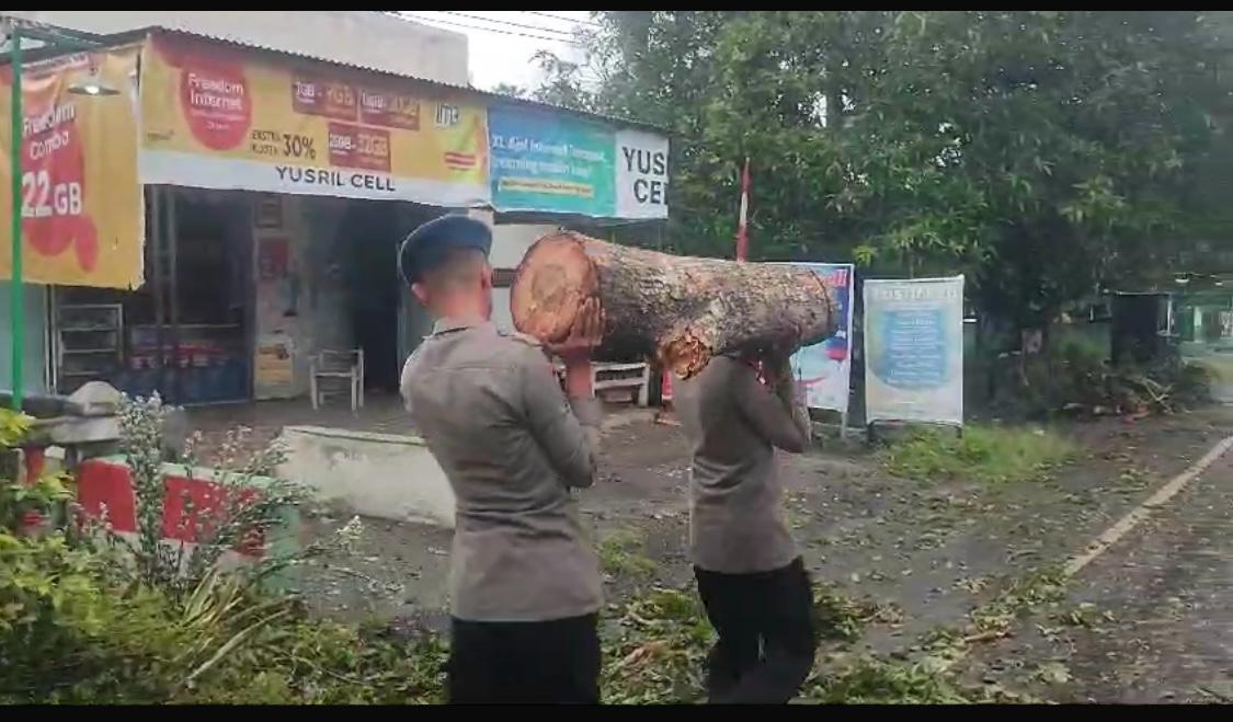 Kurang dari 1 (satu) jam, pohon tumbang di Poros Bone Makassar berhasil dievakuasi oleh tim SAR Brimob Bone.